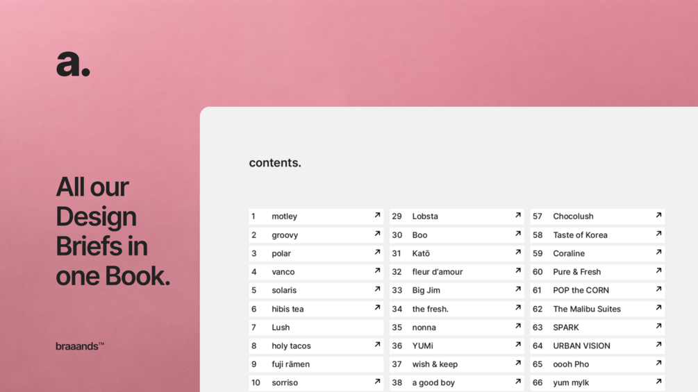 Our 84 fictional design briefs give you realistic, creative challenges inspired by real-world branding projects. Perfect for portfolio-building, creative exercises, or simply as inspiration for your next project.